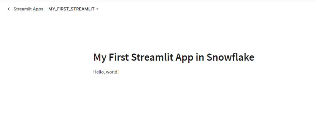 To correct the error and allow the application to run, the my_first_streamlit.py file needs to be added to the stage created above. But what goes into the file? Thankfully, because all of the libraries are already loaded in Snowflake for Streamlit, there’s not much needed to create the app. For this initial demo, I will not have the app run any Snowflake queries, only write a header and “Hello, world!” to the screen.
