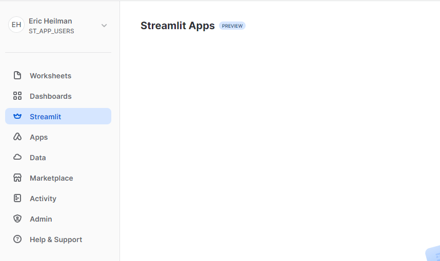 To show how this works, first I’ll set up an ST_APP_USERS role and add my user account to it. The role will not have any privileges granted when first created, so when I navigate to the STREAMLIT apps, I won’t see any in Snowsight.