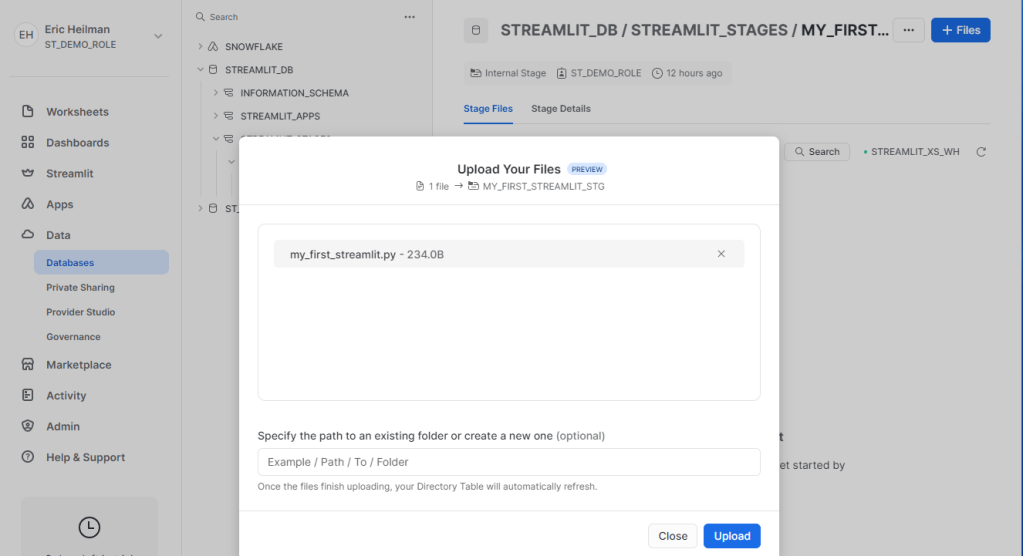 With the file saved, upload it to the stage location specified in the CREATE STREAMLIT command above. Once the file is uploaded, navigate back to the Streamlit option in Snowsight and click on the MY_FIRST_STREAMLIT app in the list which will load the app!