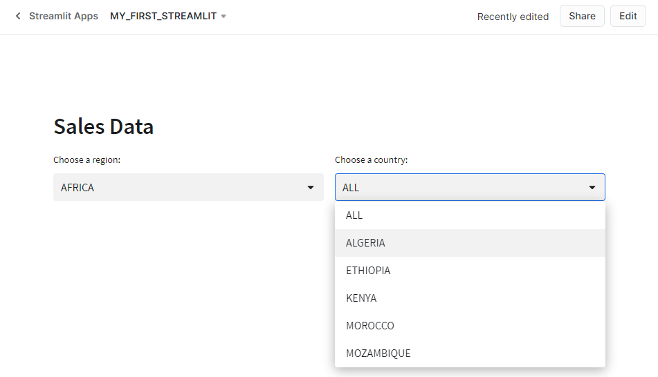 Streamlit provides several formatting options as standard functions, one of which is columns that can be set up by using st.columns(). By using st.columns, I can define co1 and col2 as variables and then reference those in my Python script to add additional Streamlit objects to them. In this case, I’ll add one selection box to each column – one on the left for a region selector, and one on the right for a country selector. The values for each selection box will come from the VW_SALES_DATA view. Additionally, the country selection box will be filtered based on the selection of the region box through the use of the Python string formatting.