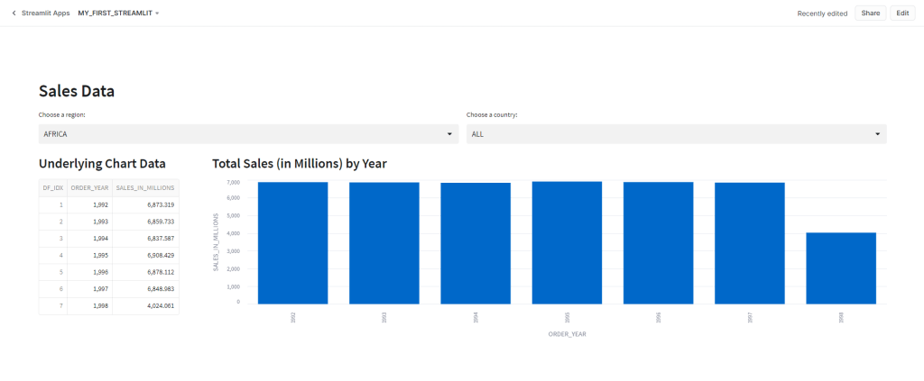 To display a bar chart as well as a data frame to show the underlying data, I’ll first need to query the VW_SALES_DATA view and apply the filters specified in the region and country select boxes. In the query, I am adding a row_number for the data index as well as converting the sales numbers into millions of dollars – primarily to keep the numbers smaller for screen output.
