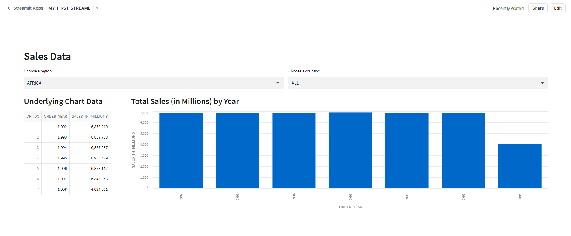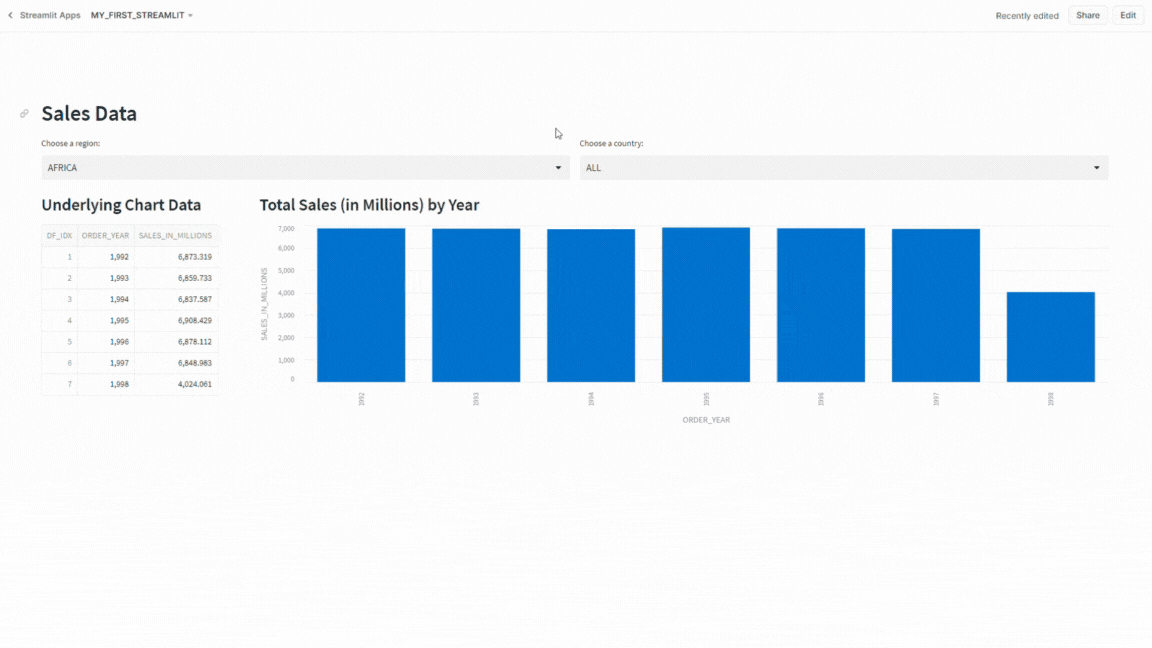 To display a bar chart as well as a data frame to show the underlying data, I’ll first need to query the VW_SALES_DATA view and apply the filters specified in the region and country select boxes. In the query, I am adding a row_number for the data index as well as converting the sales numbers into millions of dollars – primarily to keep the numbers smaller for screen output.