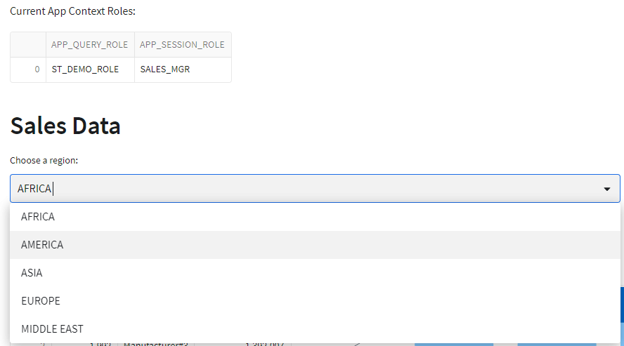 The sample row access policy limits data in the VW_SALES_DATA view based upon the REGION_NAME. The remainder of the app data is filtered based on the selected REGION_NAME. By limiting the REGION_NAME values in the selectbox in the app by role, the rest of the app will naturally filter itself.