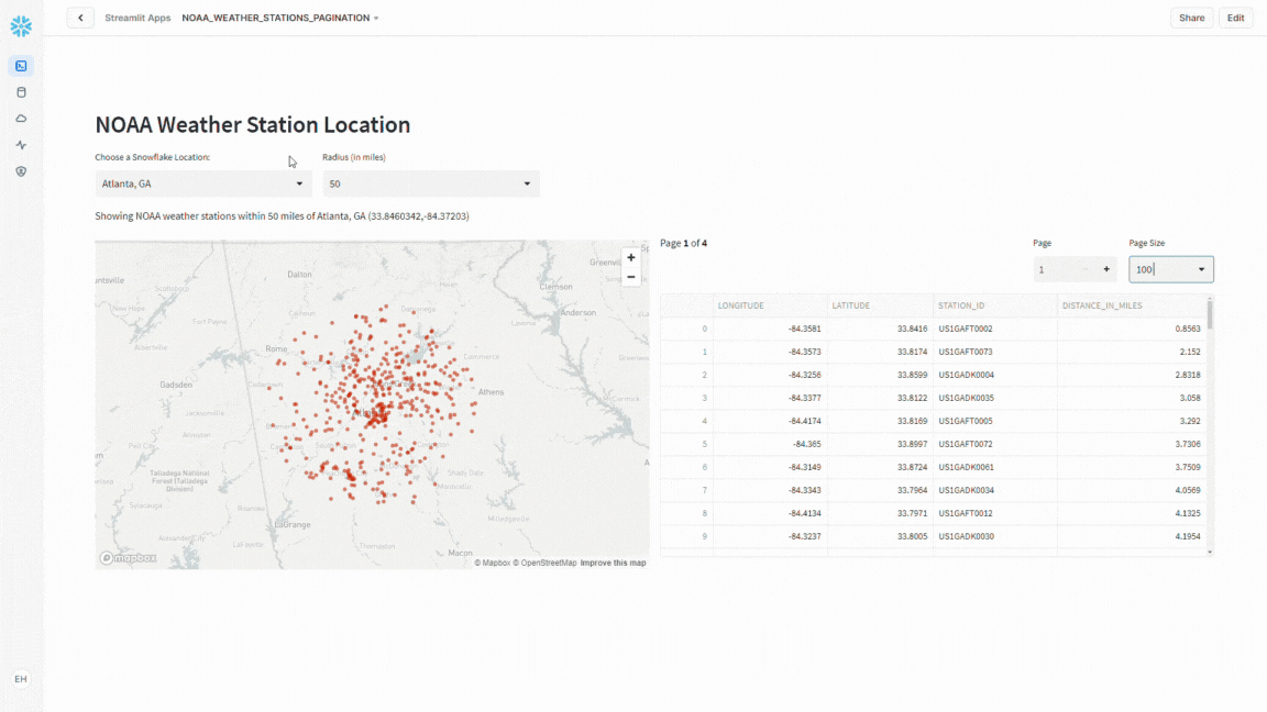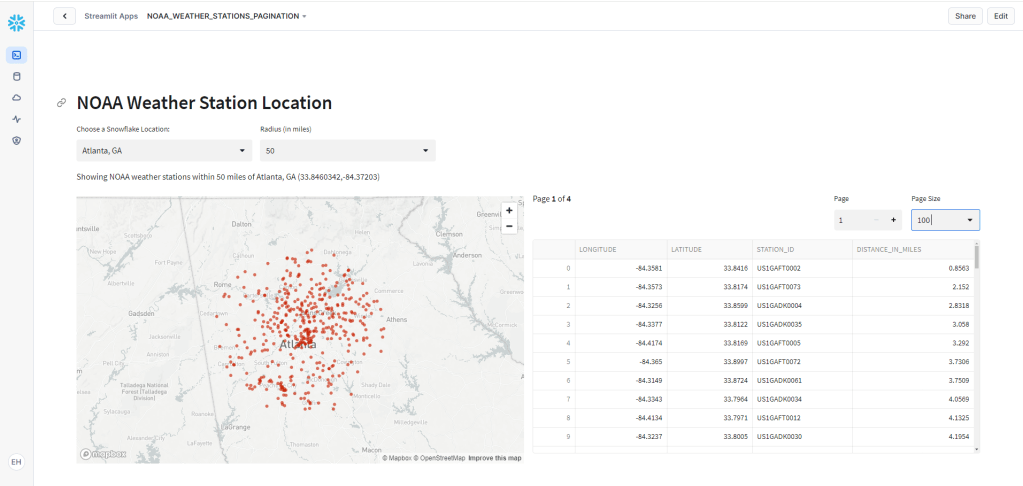 In this article, I’ll walk you through how I breathed new life into my Snowflake app, adding pagination to clunky datasets. But first, let’s rewind a bit. Remember that NOAA Weather Stations app I tinkered with in a previous article? Well, we’re about to give it a serious upgrade.