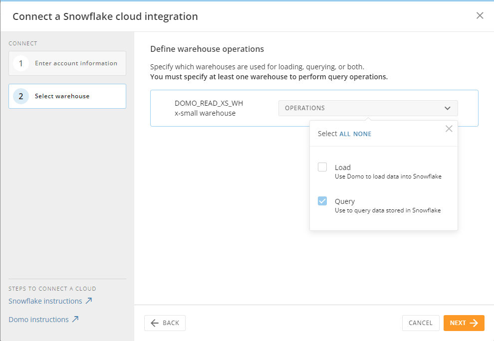 Once the connection is configured, Domo will show the list of compute warehouses the account has access to. From the operations selection box, check the QUERY option. This option will allow our connection to read from the Snowflake tables and views. After selecting Query, click Next.