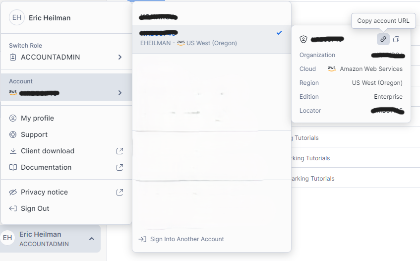 - Snowflake Connection URL: The URL for your Snowflake account which looks like XXXXXXXX.snowflakecomputing.com where the X’s represent your account. Do not include the https:// in the URL. You can get this information from your Snowflake account through Snowsight: