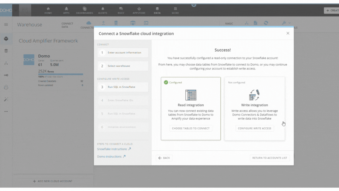 In this article, we walked through setting up Domo for read access to Snowflake using Cloud Amplifier. We started by logging into Domo, navigating to the Data Warehouse interface, and creating a new integration with Snowflake by configuring essential settings like the connection URL, username, and password. We also covered optimizing performance by adjusting data update frequency and cache TTL.