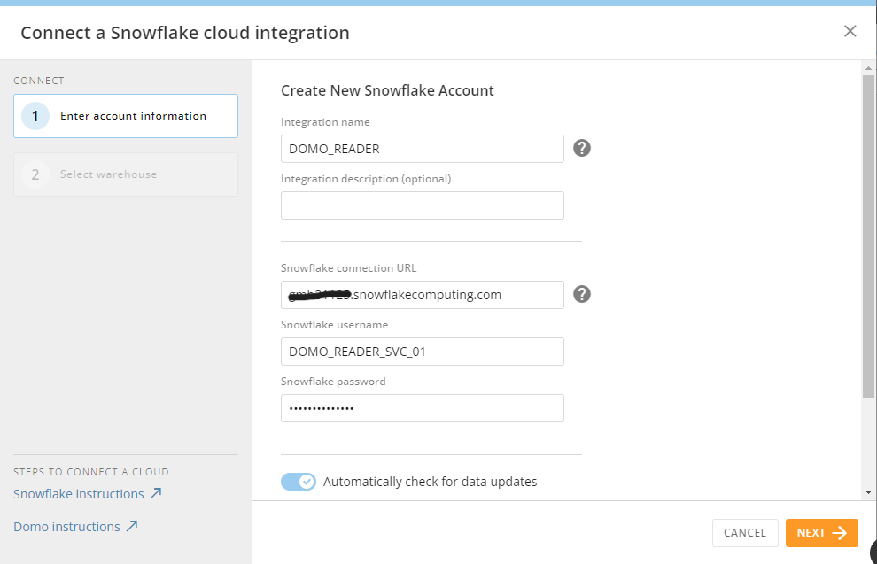 - Snowflake Username: username of the account to connect to Snowflake. I’ll use the reader service account created previously: DOMO_READER_SVC_01