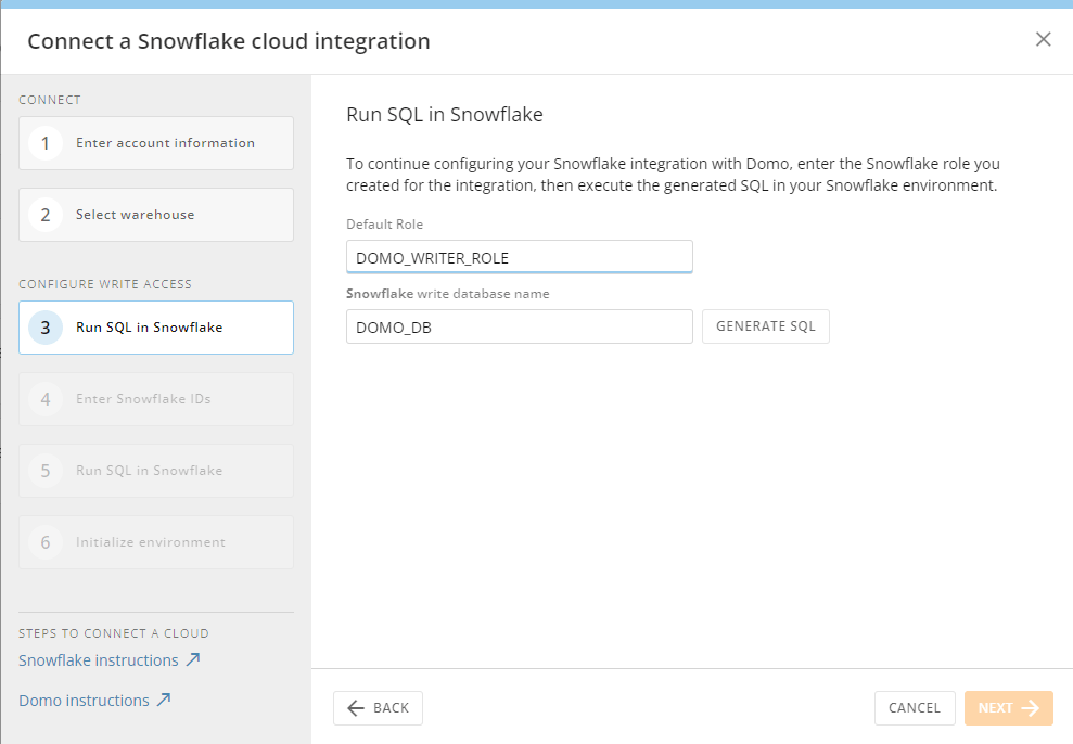 Enter the role and database name configured in the initial setup, and then click Generate SQL. Domo will generate three SQL Commands to run in your Snowflake account. The first one should look familiar as we already ran that as part of our initial setup. The second and third commands will need to be copied and executed in Snowflake to setup the integration between Snowflake and Domo.