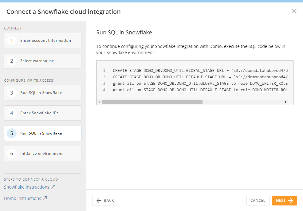 Finally, copy the last SQL Command and execute it in Snowflake to complete setup of the Stages needed for Domo to write to Snowflake. After doing so, click Next. Domo will prompt one last screen asking you to confirm that Domo can make changes to your Snowflake account. Check the box and click Next.