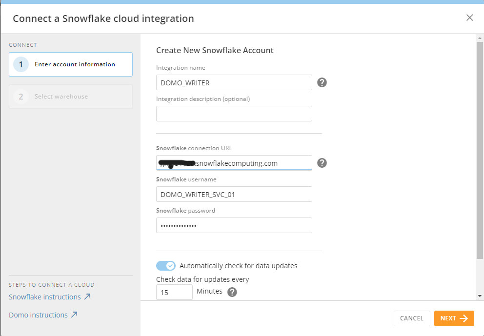 - Check for data updates every: this setting is how frequently Domo will check for data changes in Snowflake. Adjusting this value to match the frequency of your Snowflake data loads/changes will help with Snowflake costs. Every “check” from Domo will consume Snowflake credits to query metadata looking for data changes. If your data only loads once a day, there’s no need for Domo to check every 15 minutes for changes.
