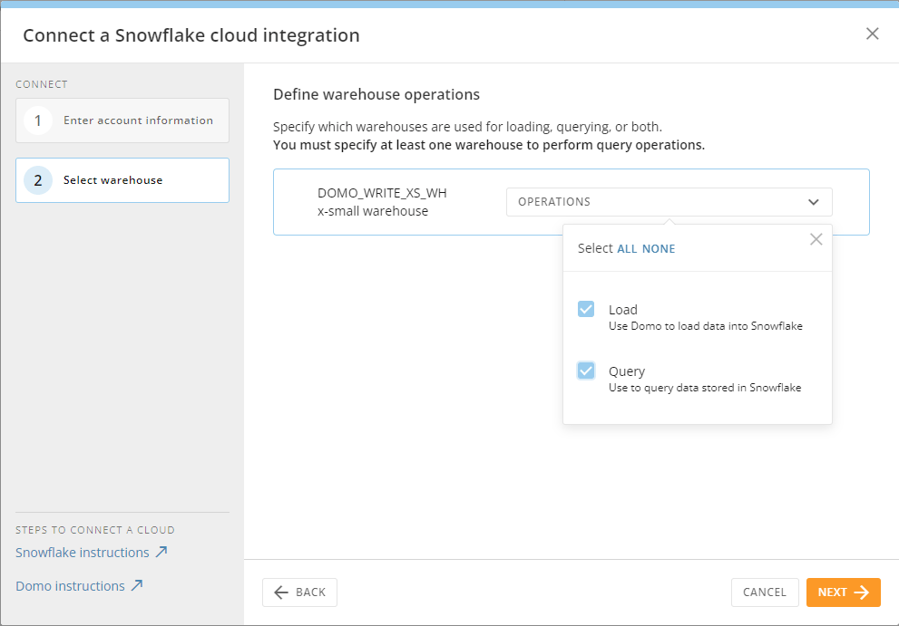 Once the connection is configured, Domo will show the list of compute warehouses the account has access to. From the operations selection box, check the LOAD and QUERY options. These options will allow our connection to read and write from the Snowflake.