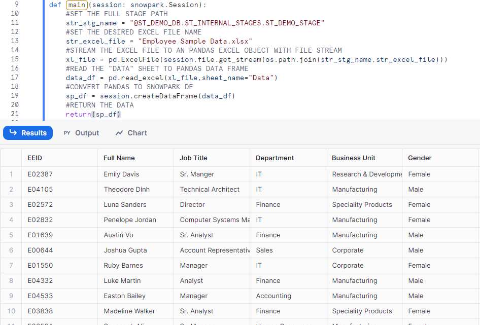 The code samples shown assume the desired Excel file is already loaded into an internal Snowflake stage and the user executing the code has proper use/table creation privileges on the stage and target database schema in Snowflake. For the purposes of the demo, I used a sample Excel file from thespreadsheetguru.com