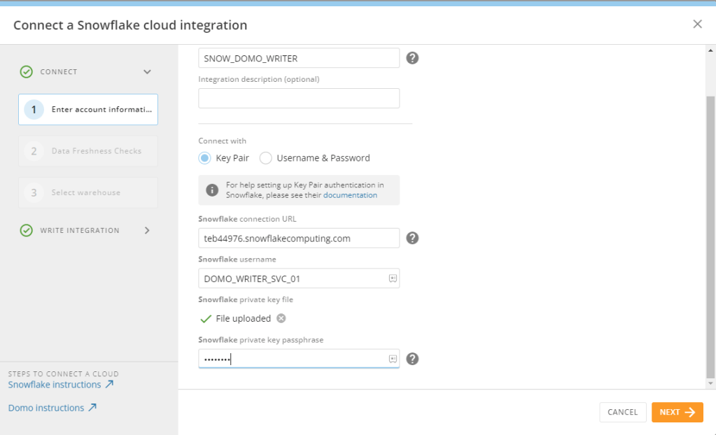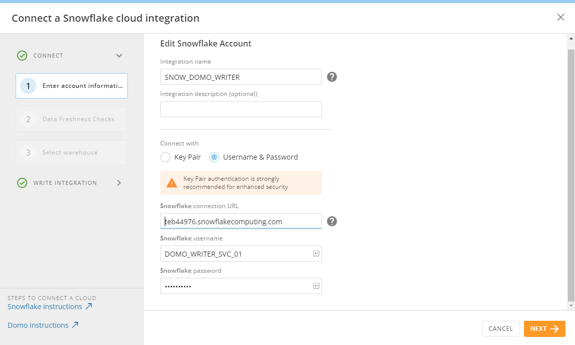 Now that I have updated my users, I can go back into my Domo Cloud Amplifier setup and convert the connection from using username and password to using the Key Pair. Notice once I enter the integration screen, Domo recommends using a key pair.