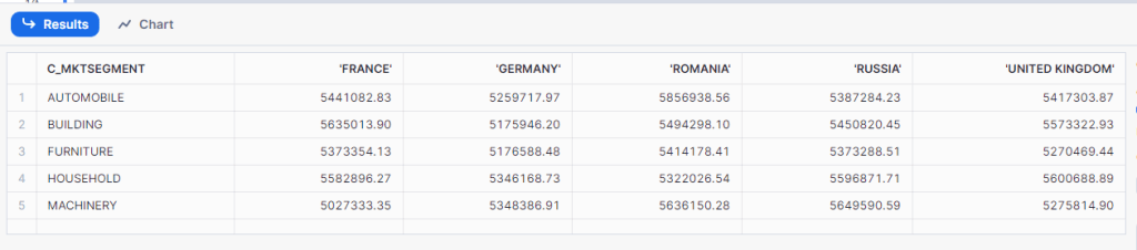In this case, the C_MKTSEGMENT remains a row header, and the account balances (C_ACCTBAL) for each nation are pivoted into columns. Each column corresponds to the account balance sums for a particular nation within the region specified.