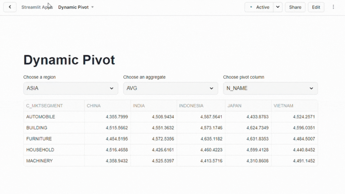 In a previous article, I described how to use Snowflake’s SQL to set up a dynamic pivot query without using any dynamic SQL. In this post, we’ll take that a step further and build a quick Streamlit in Snowflake app that will allow configuration of parts of the query and display the results in a data frame.