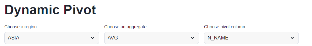 The region select box values will come from the view, and the aggregate and pivot columns values will be entered as static values. Each chosen select box value will be stored in variables used in the next step.