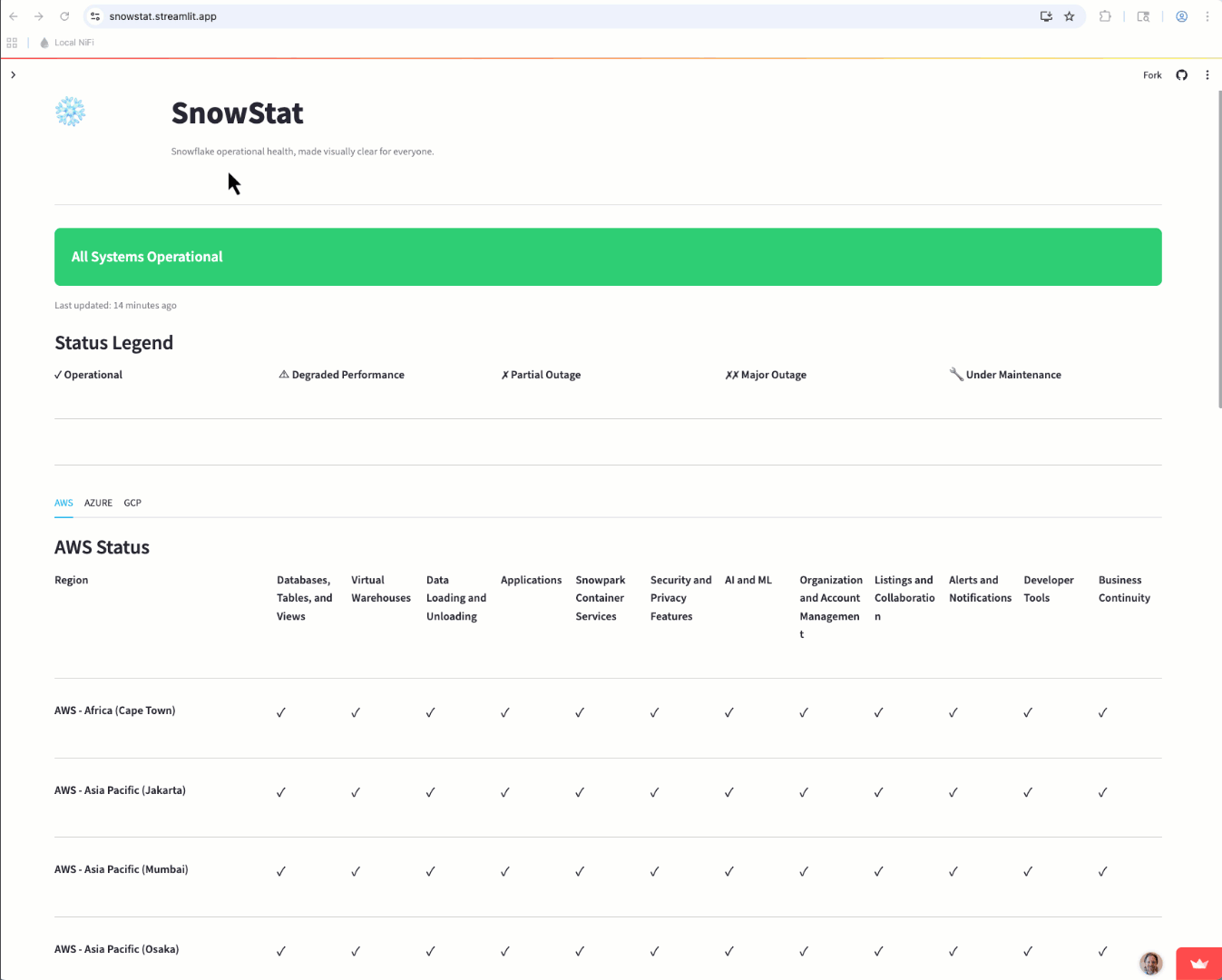 TL;DR: I rebuilt the Snowflake status page as a single‑page Streamlit app with icon‑first indicators. It’s fast to scan, friendly for colorblind users, and faithful to the original layout.